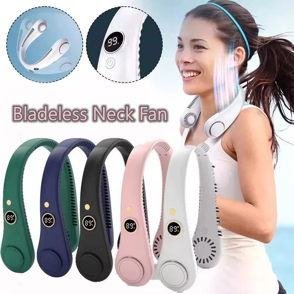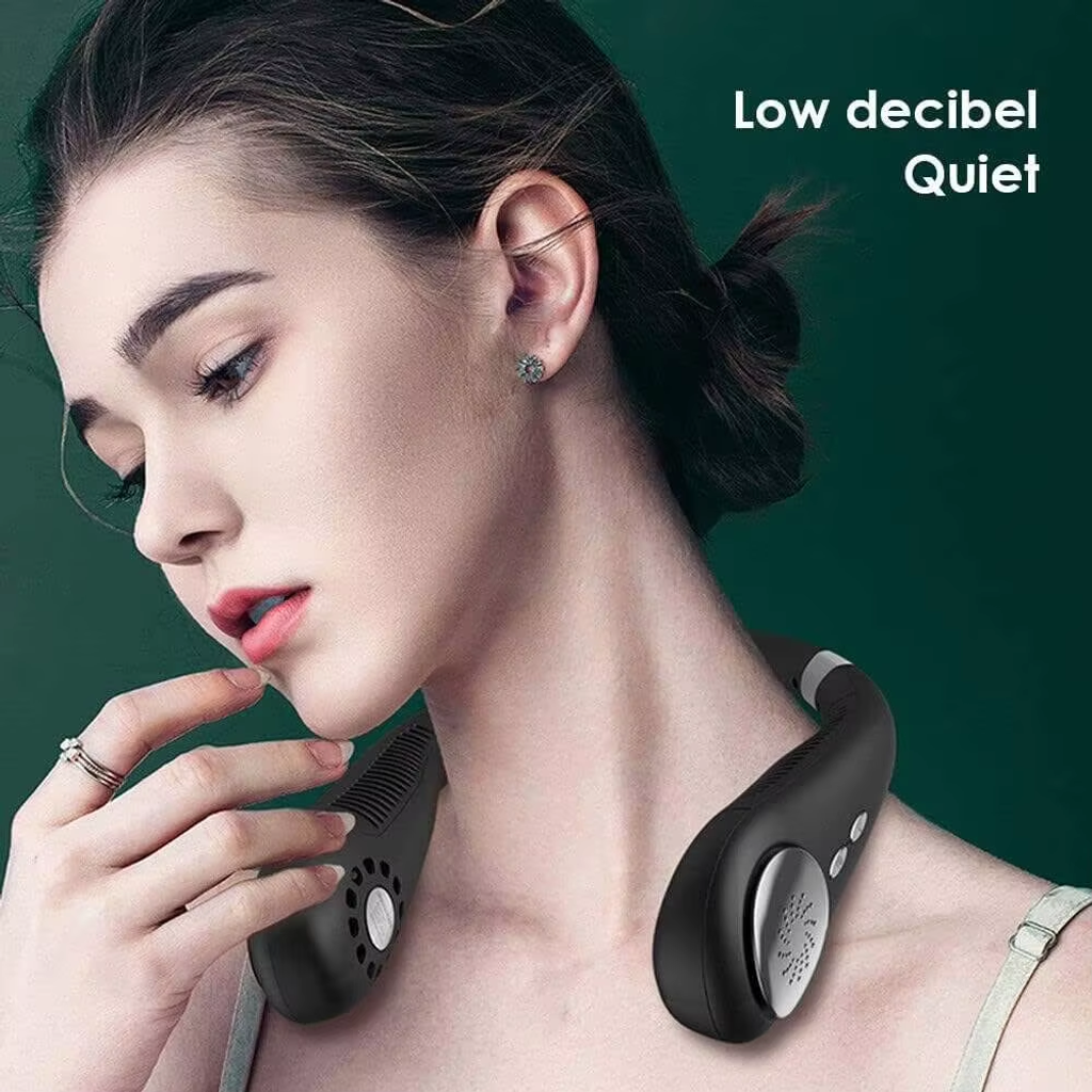Portable USB bladeless turbine neck-hanging fan with extended battery life, silent operation, rechargeable, five wind speeds, ideal for outdoor activities